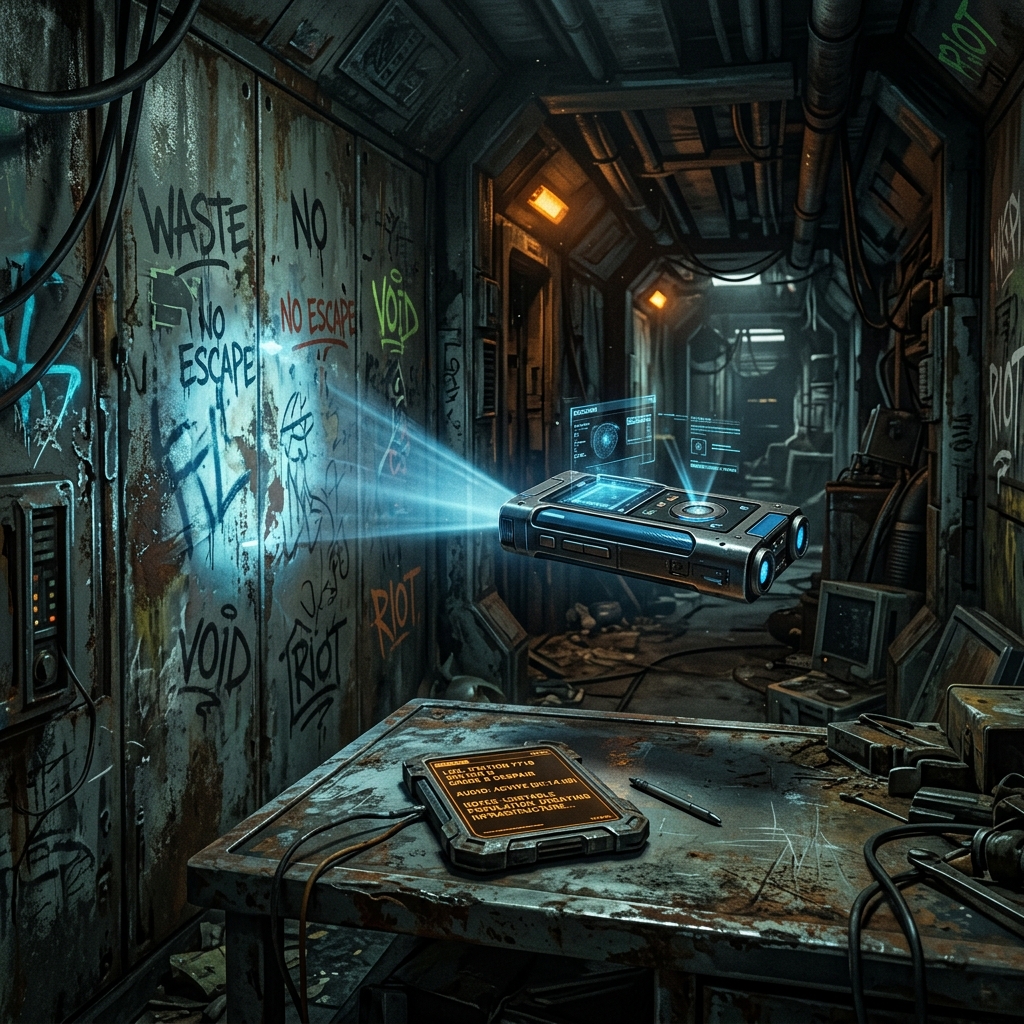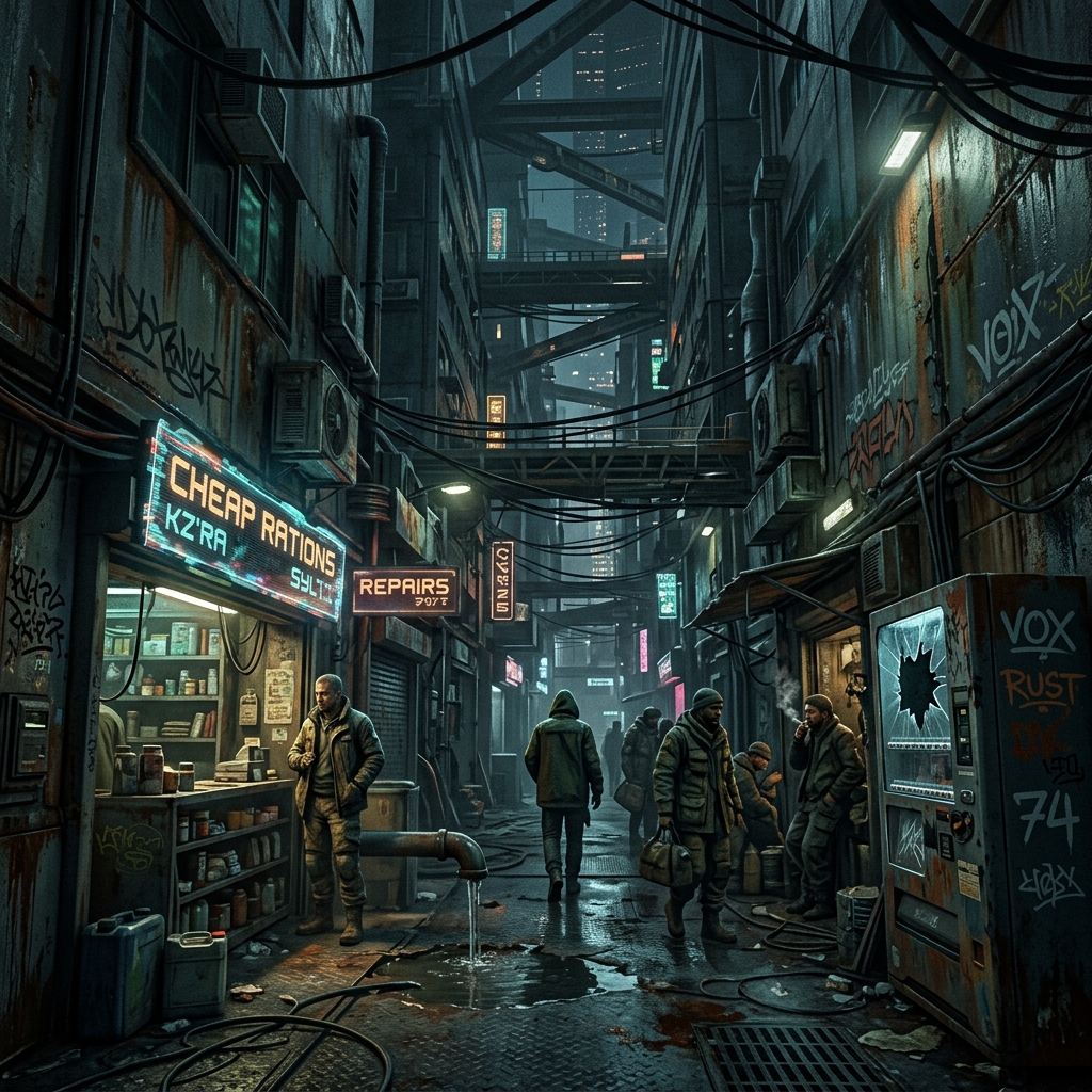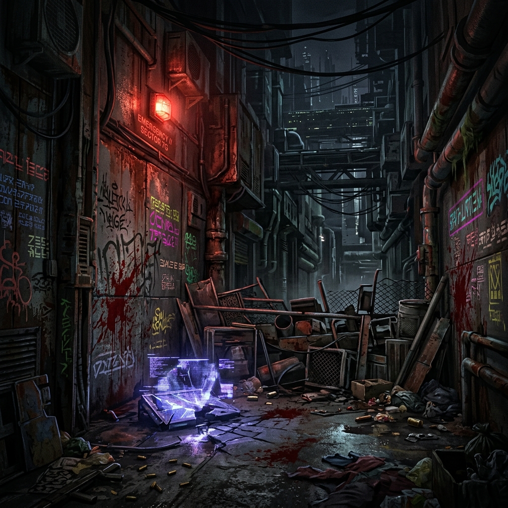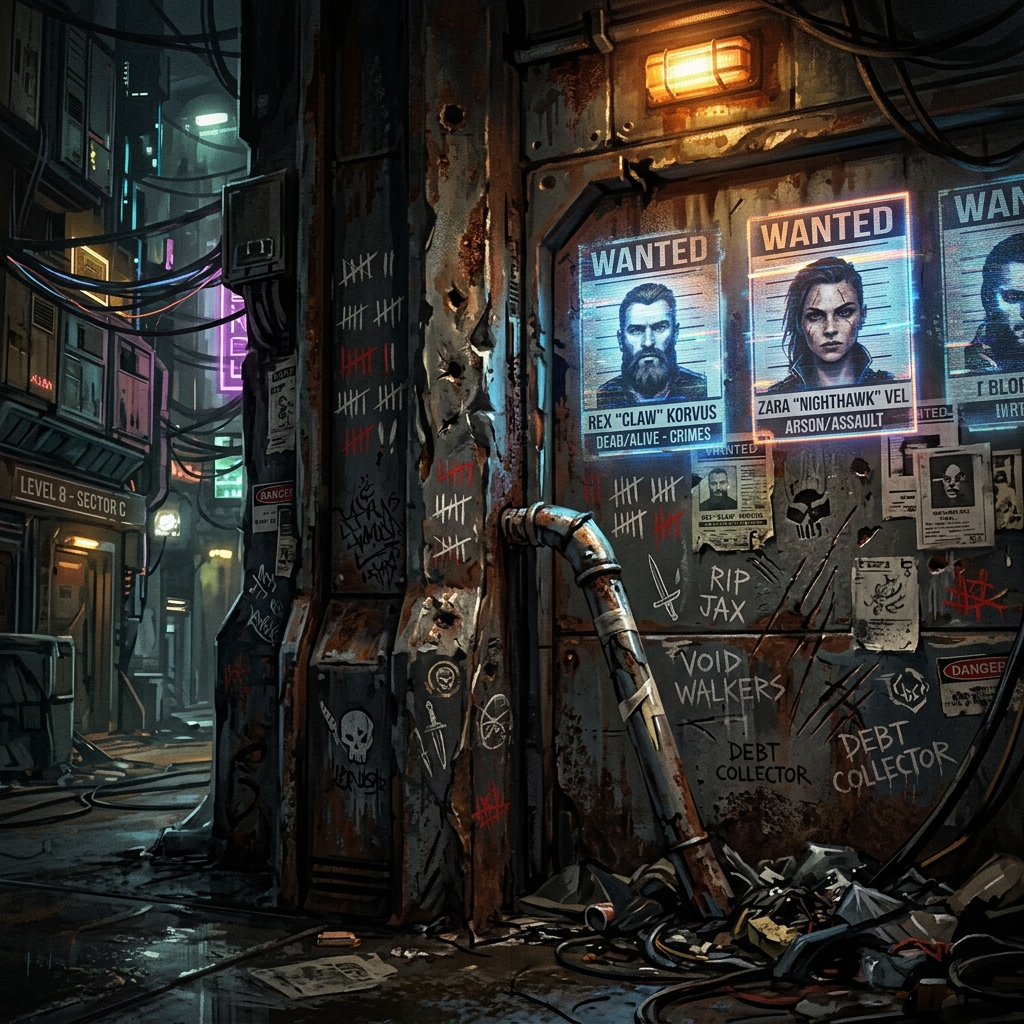 Fig.08 — 下層居住区の壁面。落書き、殴打痕、指名手配のホログラムが重なり合う。