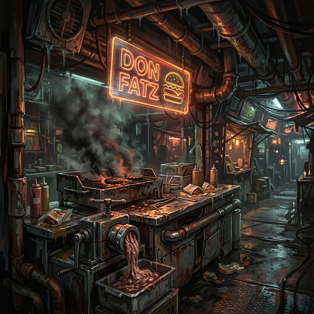 「ドン・ファッツ」は下層で最も人気のある屋台チェーンだ。看板メニューの「星間挽肉バーガー」は一個三クレジット。