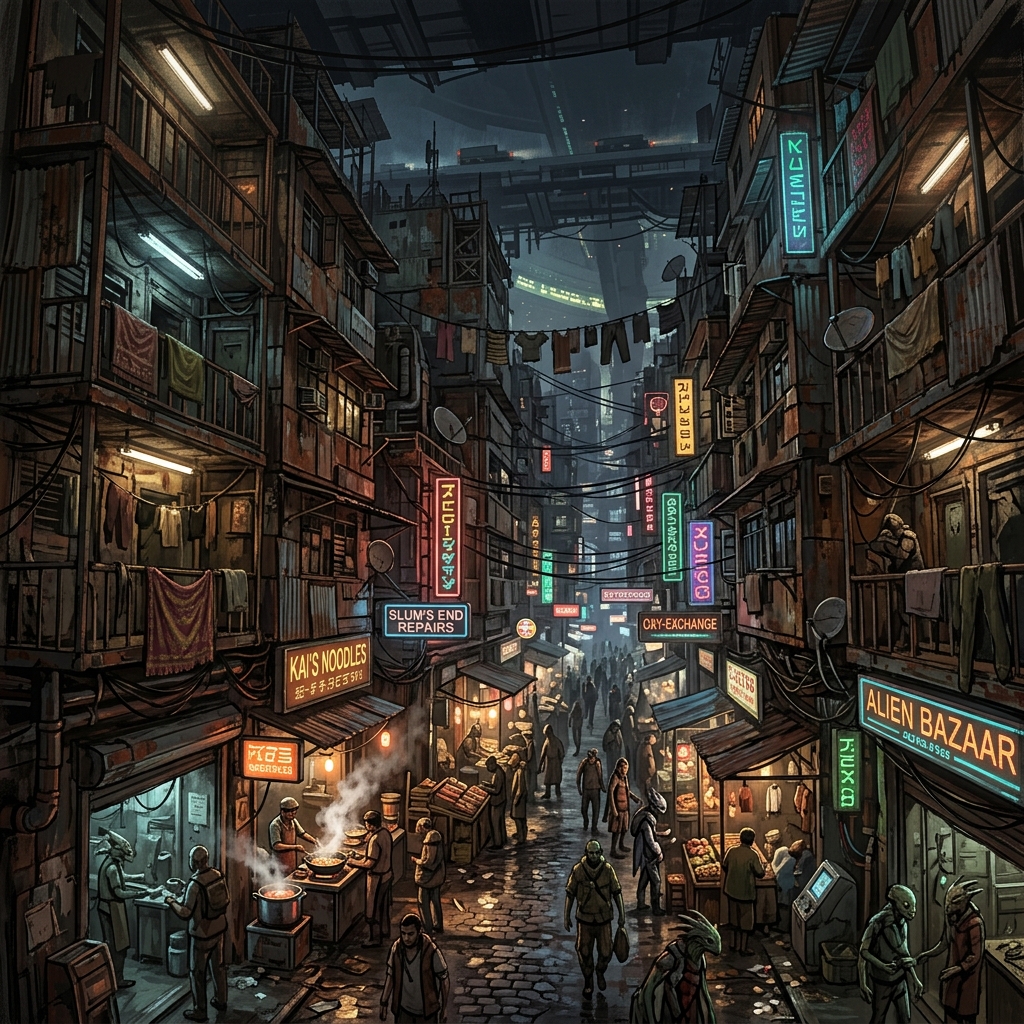 Fig.15 — 下層居住区。この街並みの中に数十万の人間と、数十種の宇宙種族が暮らしている。