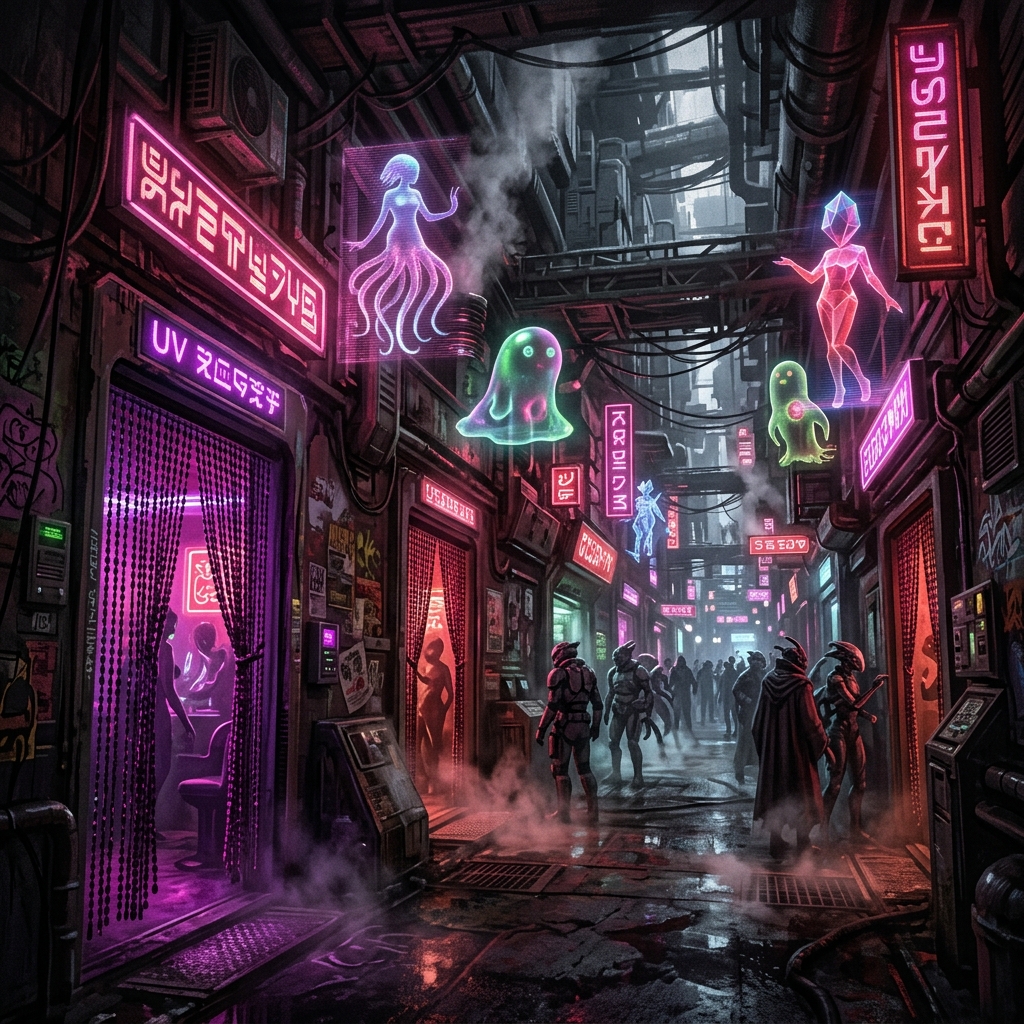 Fig.11 — 下層居住区E-7~E-12ブロック通称「ナイトレーン」。異星種族向けの性風俗店が密集する。